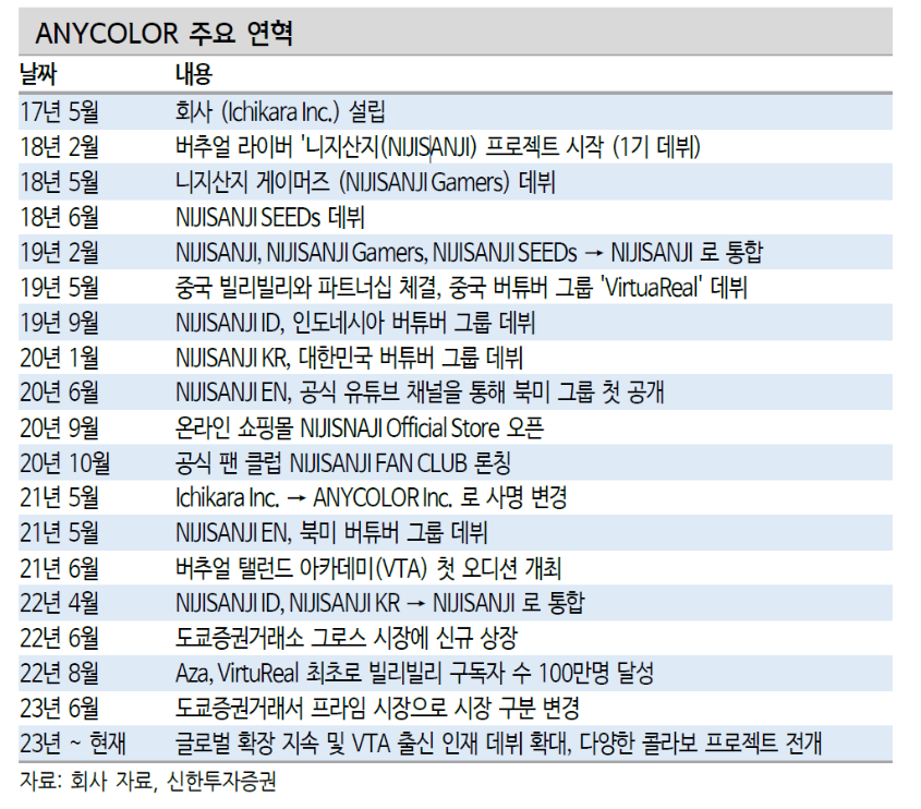ANYCOLOR Inc.(TSE: 5032)은 일본 도쿄에 본사를 둔 글로벌 버추얼 유튜버(VTuber) 및 디지털 엔터테인먼트 기업입니다. 2017년 설립된 이 회사는 대표 브랜드 “니지산지(NIJISANJI)“를 비롯해, 다양한 버추얼 크리에이터의 매니지먼트, 콘텐츠 제작, 라이브 스트리밍, 굿즈·콜라보 비즈니스 등을 전개하고 있습니다.