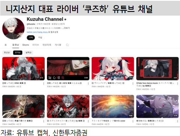 일본 버튜버 산업의 성장 잠재력이 크다. 다수의 스트리머들이 방송하며 생태계를 이루는 국내 개인방송 시장과 다르게 일본의 버튜버 산업은 마치 엔터테인먼트 산업처럼 비교적 소수의(100~200명)버튜버들이 팬덤을 확대해 나가는 구조로 성장 중이다.