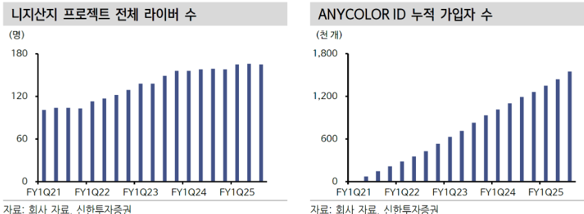 공식 플랫폼 기반 코어 팬덤 지표인 ANYCOLOR ID 가입자 수는 매분기 7~8%씩 증가하여, 2025년 1월 기준 총 155만 개의 계정이 등록되어있다. 해당 계정은 유료 팬 커뮤니티 ‘니지산지 팬클럽’ 및 온라인 스토어 이용에 필수로, 실질 수요 기반 지표로 기능한다. 실시간 스트리밍 지표도 견조하다. VSTATS에 따르면, 2024년 4분기 기준 니지산지의 총 시청시간은 8,320만 시간을 기록하였다
