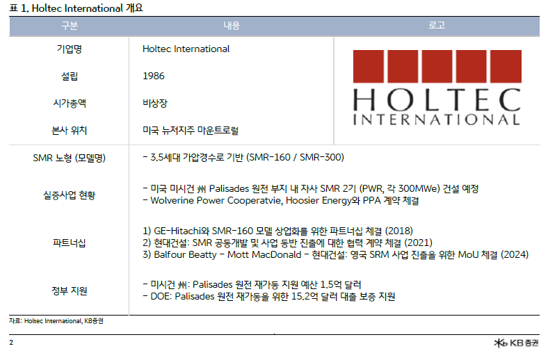 Holtec은 사용후핵연료 저장장치·원전해체 시장에서 Global Top 3에 속하며, SMR 분야에서는 미국 내 선도권을 확보, 소형모듈원자로 글로벌 시장 초기 선두주자 중 하나입니다.