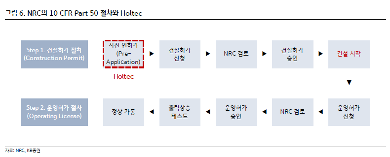 원자로에 대한 라이선스를 획득하기 위해 NRC의 10 CFR Part 50 절차를 진행하고 있으며 2026년 1분기 건설허가를 신청해 2029년 운영허가를 취득할 계획이다. 10 CFR Part 50 절차는 총 2단계로 구성된 인허가 제도이며 현재 미국에서 운영 중인 원전들에 적용되었던 인허가 절차이다. 이 제도는 건설허가를 취득 후 완공 직전에 운영허가를 받는 방식으로 이 경우 공사 중 설계 조정이 가능해 유연성을 확보할 수 있다.
