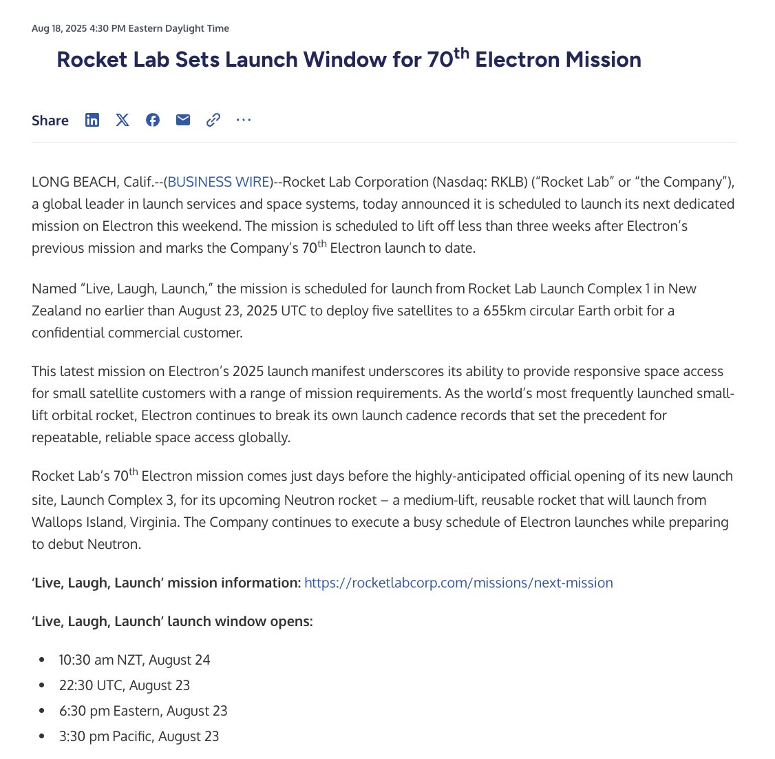 - ROCKET LAB CORP - 이번 주말 다음 일렉트론 미션 발표