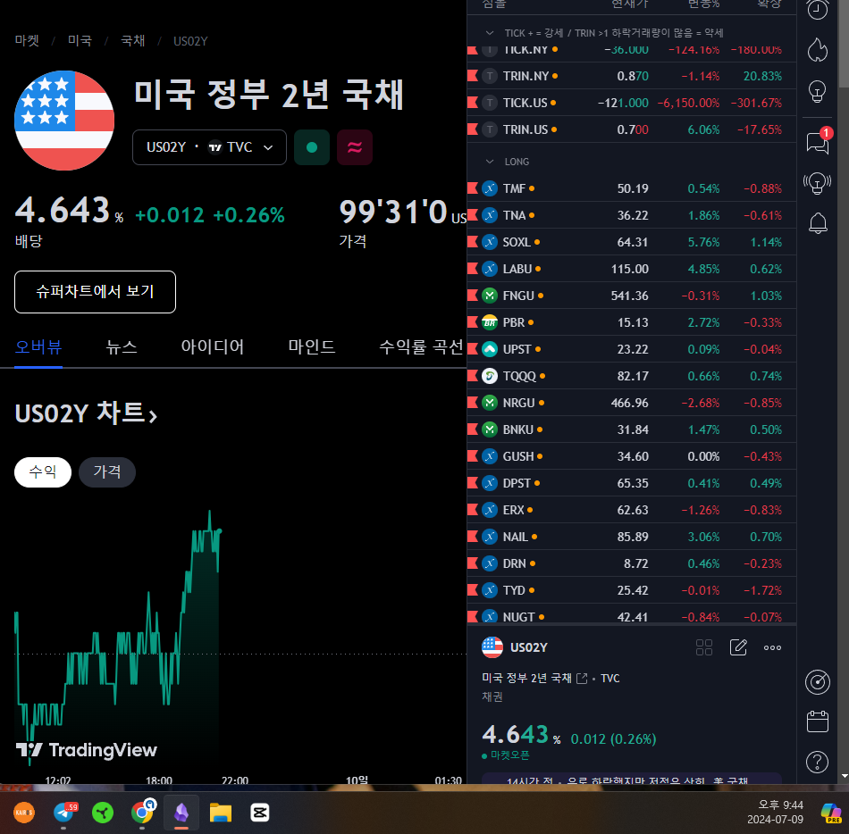 2%까지 상승했던 SOXL이 1%대로 내려앉은 모습, 채권 금리는 소폭 상승 중인데