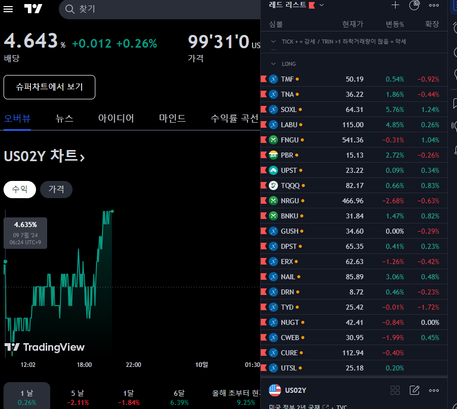 2%까지 상승했던 SOXL이 1%대로 내려앉은 모습, 채권 금리는 소폭 상승 중인데