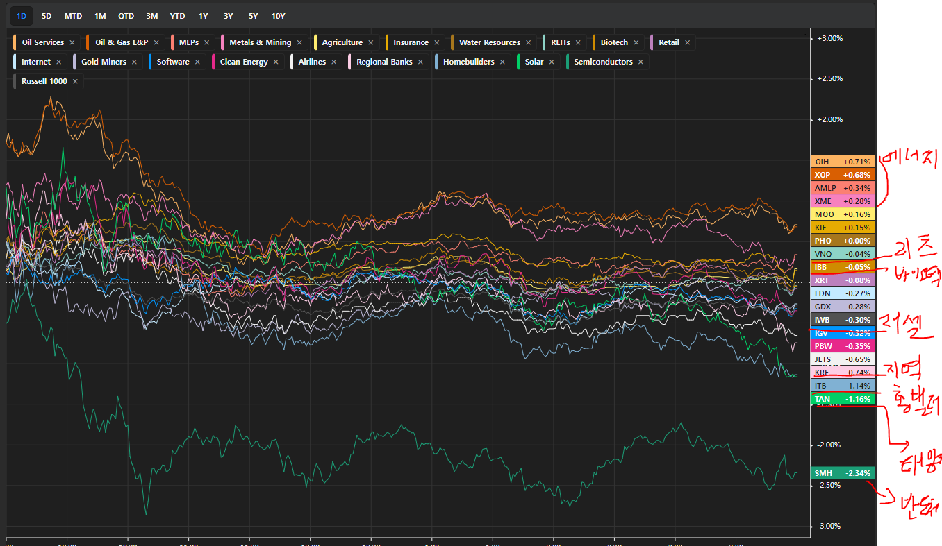 세부적으로 보면 [에너지 > 리츠 > 바이오텍 > 러셀 >지역은행 > 홈빌더 > 태양광 > 반도체] 순으로 강했음