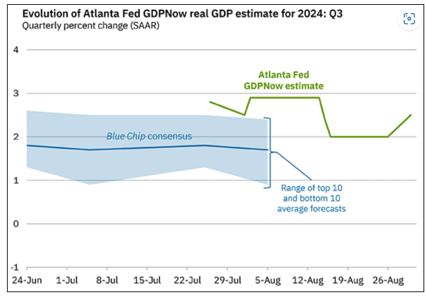 - 애틀란타연방은행GDP 애틀란타 연방은행의 GDP NOW의 경우 PCE의 양호한 소비 데이터를 반영해 기존 2%에서 2.5%로 3분기 GDP 전망을 상향함