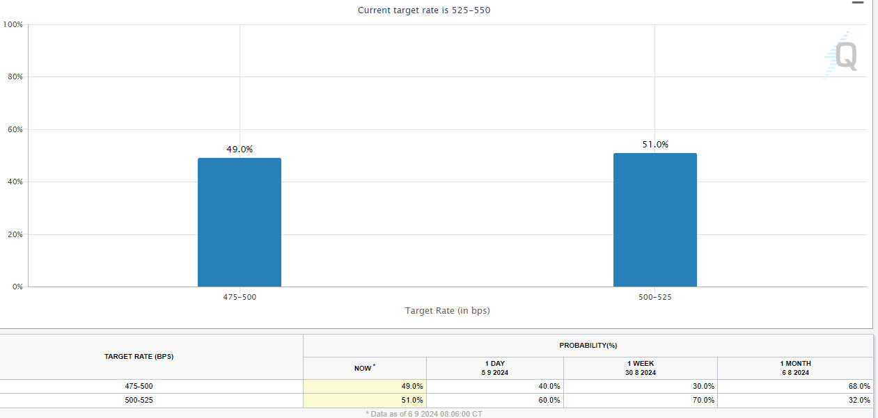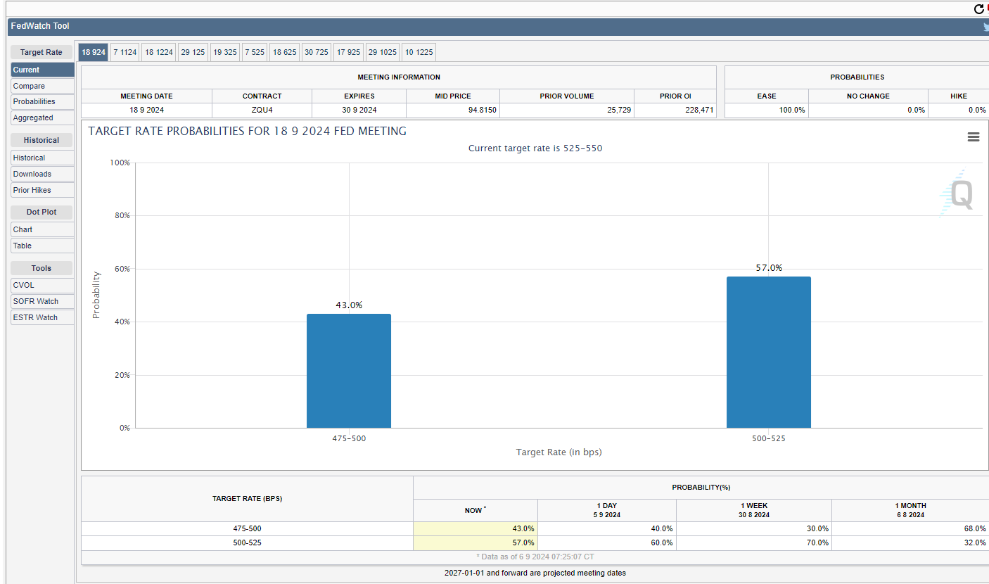 고용보고서 발표 이후 9월 50bp 인하 확률이 즉각적으로 높아졌지만 여전히 40%대로 25bp 인하 확률이 우위