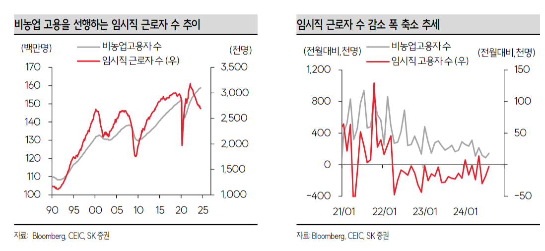 ③고용시장을 선행하는 임시직 근로자 감소 폭이 줄어들고 있음. 즉, 기업들은 최근 대선 관련 정책 불확실성 그리고 경 기에 대한 우려로 적극적인 채용을 하지 않는 분위기. 임시직 근로자는 상용 근로자 대비 채용 및 해고가 자유로우며 고 용시장 경기를 선행하는 특성. 과거 침체와 이에 따른 고용시장 냉각 이전 임시직 근로자가 먼저 감소세로 전환된 바 있 음. 이후 비농업고용에서 감소세가 나타나기 시작해 침체를 거치고 이후 경제 회복 과정에서 임시직 근로자가 먼저 재차 플러스 전환되는 패턴. 이번 사이클에서 임시직 근로자는 지난 2022 년 4 월부터 감소하기 시작해 점차 그 감소 폭을 축소하고 있었음. 이번에도 이러한 패턴이 지속된다면 이번 사이클에서 고용시장 둔화도 그 폭이나 기간이 과거 대비 얕 고 짧을 수 있음을 시사)
