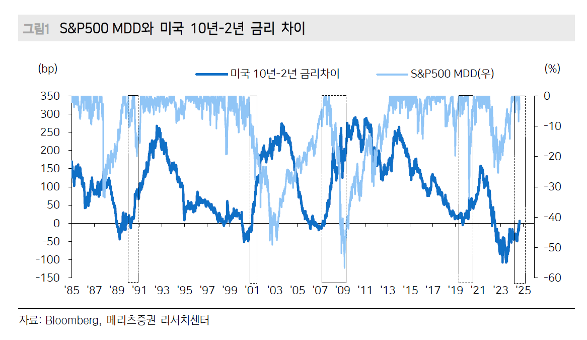 금리인하 기대가 강화되면서 단기물 중심으로 금리 하락하며 미국채 장단기 금리 차 역전이 해소. 주식시장의 우려는 과거 장단기 금리 역전 이후 금리 역전이 해소되는 구간에서 주가 하락 추세가 나타났다는 경험일 가능성.