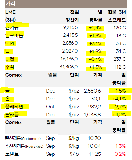 아연: Boliden사의 노르웨이 Odda 제련소 확장 공사가 늦어지면서 생산량 증가(기존 20만 톤→35만 톤) 시점 또한 2024년 4분기에서 2025년 1분기 말로 연기될 것으로 예상되자 큰 폭으로 상승(+3.1%)