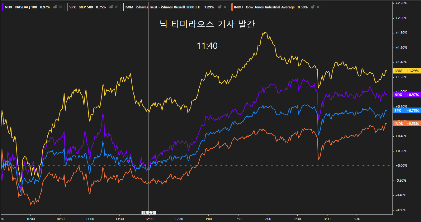 미국 시간으로 12시 연준의 입인 닉티미라오스의 “25bp, 50bp 결정된 것은 없을 수 있다"는 느낌의 기사가 나온 후 CME FedWatch 상 14%까지 대폭 축소됐던 9 월 50bp 인하 확률은 35%로 재차 반등하며 투심 회복