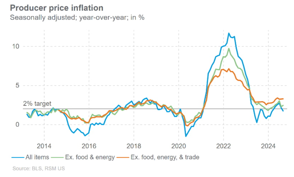 PPI 8 월 PPI 는 헤드라인 0.2%MoM 상승하며 컨센(0.1%)을 상회, 전월 대비(0.0%)도 상승. 다만 시장의 컨센 레인지인 0.1~0.2%를 크게 벗어나지 않아 서프라이즈 수준은 아님. YoY 기준으로는 +1.7%로 컨센(1.8%YoY)를 하회하며 6 개월만에 2%대를 하회. 근원 PPI 는 전월비 0.3%MoM 상승하며 컨센(0.2%)을 상회했는데 숙박업 등의 렌탈 서비스 가격 상승으로 인한 서비스 부문의 가격 상승이 주 요인