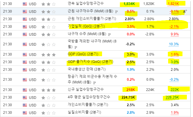 - 주간실업수당청구 9월 4주차, 주간 실업수당 청구건수는 21.8 만건으로 컨센(22.5 만)을 하회, 직전주 대비(22.2 만)로도 4 천명 가량 축소. 다만 연속 실업수당청구건수는 183.4 만명으로 직전주(182.9 만)보다 상승 -산업-테마공부/1.경제/매크로/1.경기/미국GDP/미국GDP] 2 분기 GDP 성장률 확정치는 연율 +3.0%로 추가적 변수 없이 컨센과 잠정치와 동일한 수준으로 발표. PCE 와 근원 PCE 모두 잠정치와 동일하게 2.5%와 2.8%로 전분기 대비 하락하는 그림을 유지하며 현재 인하 사이클과 경기 기대감을 현상유지시키는 모습