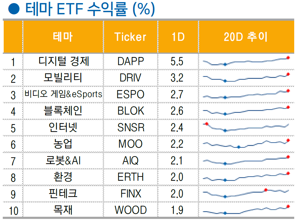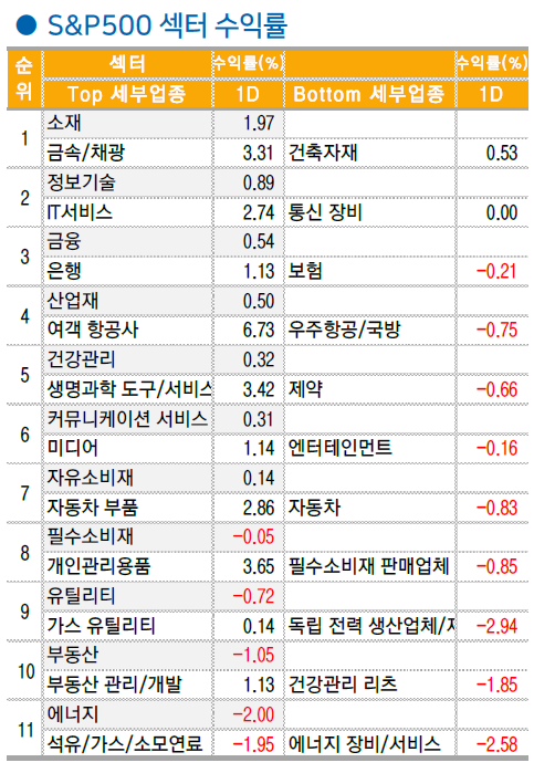 높은 변동성을 보였던 기술주와는 달리 DOW 와 중국 익스포져의 영향을 받은 소재(+2%), 산업재(+0.5%)등의 섹터는 견조한 상승세를 유지하며 섹터간 차별화가 두드러짐. 특히 중국의 부양책 등장과 구리 가격 상승을 반영한 프리포트맥모란(+7.4%), 서던코퍼(+8.2%)을 비롯 BHP (+5.5%), 앨버말(+9.9%), 리오틴토(+4.6%) 등 광물, 광산 관련 업종이 강세를 보임.