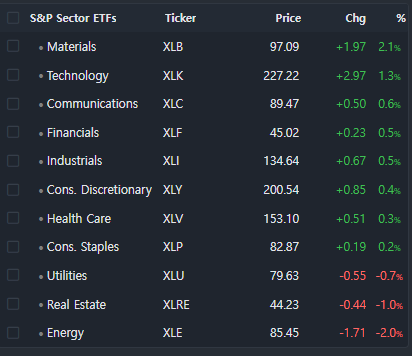 높은 변동성을 보였던 기술주와는 달리 DOW 와 중국 익스포져의 영향을 받은 소재(+2%), 산업재(+0.5%)등의 섹터는 견조한 상승세를 유지하며 섹터간 차별화가 두드러짐. 특히 중국의 부양책 등장과 구리 가격 상승을 반영한 프리포트맥모란(+7.4%), 서던코퍼(+8.2%)을 비롯 BHP (+5.5%), 앨버말(+9.9%), 리오틴토(+4.6%) 등 광물, 광산 관련 업종이 강세를 보임.