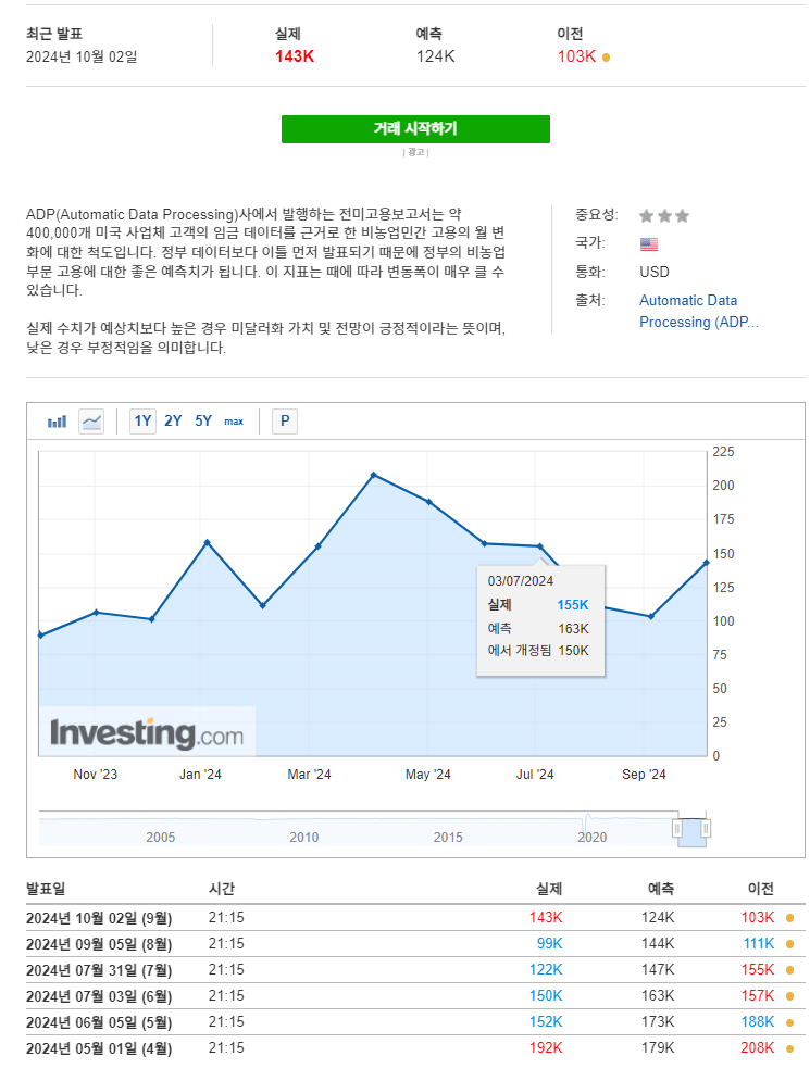 - 미국 ADP 비농업부문 고용 9월 미국 ADP 고용 변화 실제 143k (예상 125k, [이전 99k, 수정 103K])