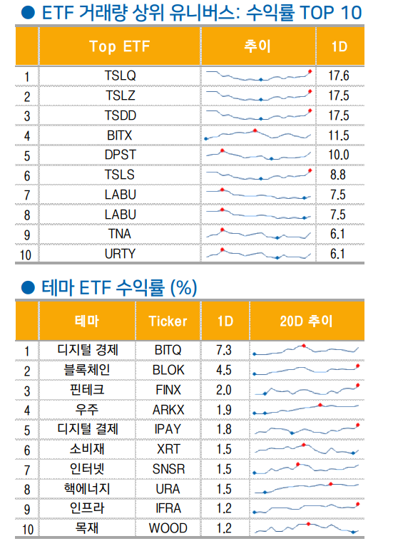 - 현지시간 10월 10일 저녁 개최된 로보택시 행사를 앞두고 기대감 지속. 행사 시작 후 바퀴 와 페달이 없는 20인승용 로보택시 ‘사이버캡’과 옵티머스 휴머노이드용 로봇을 공개. 다만, 주요 IB들이 구체적 비전과 데이터 등 디테일이 상당히 부족했다는 평가가 앞서자 주가 급락, 나스닥 전반의 상승폭을 축소. Morgan Stanley는 이번 행사 서 사이버캡의 시장 출시 계획, 차량 공유 서비스, FSD 기술의 변동 요인 등 구체적인 데이터 공개가 부족했다 지적. 특히 시 장이 가장 주목했던 사이버캡에 대한 적용 기술(하드웨어, 센서 등), 안정성, 생산케파 등이 부재했던 점도 실망감으로 작용. Barclays는 테슬라가 단기 모멘텀에 대한 강조가 부족했다고 평가. 그간 테슬라가 매 행사 서 구체적인 데이터뿐만 아니라 AI/AV에 대한 동사의 개발 과 정 등 성장성을 강조해왔으나, 이번 행사에서는 저가 모델에 대한 생산 계획도 공개되지 않았 다고 지적. 한편, 로보택시 행사 이후 우버(UBER +10.8%), 리프트(LYFT +9.6%) 등 차량공유 사업 영위 업체들은 반사이익 수혜로 급등 마감하는 모습