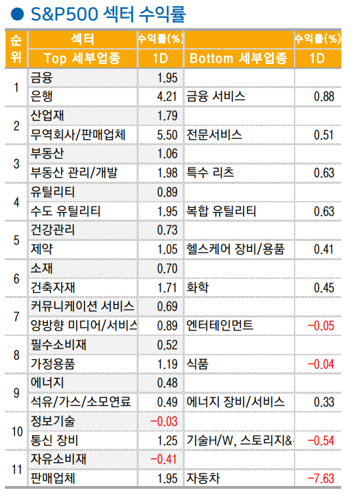 중소형주의 러셀을 비롯, 여러 섹터로의 온기 확산을 위한 환경 조성 금융(+2.0%) 섹터가 은행(+4.2%)업종의 호실적과 함께 가장 큰 폭으로 상승했으며 산업재(+1.8%), 부동산(+1.1%), 유틸리티(+0.9%) 등 강세. 경기소비재(-0.4%)는