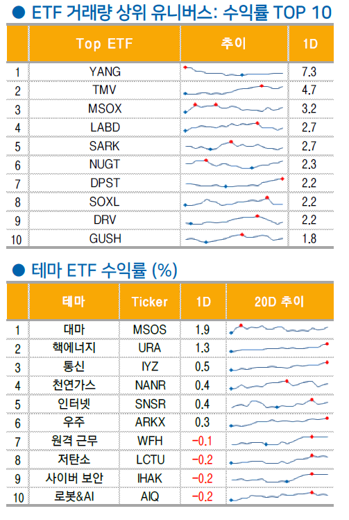 다만 금리 인하 기대감 후퇴와 앞선 ASML 어닝 쇼크로 반도체 업종 내에서도 TSMC(TSM +9.8%)발 모멘텀을에 차별화 발생. 브로드컴(AVGO +2.7%), 마이크론(MU +2.6%), ARM(+1.4%), 엔비디아(NVDA +0.9%) 강세보인 반면 마벨테크(-2.2%), 램리서치(LRCX -1.4%) 등 부진