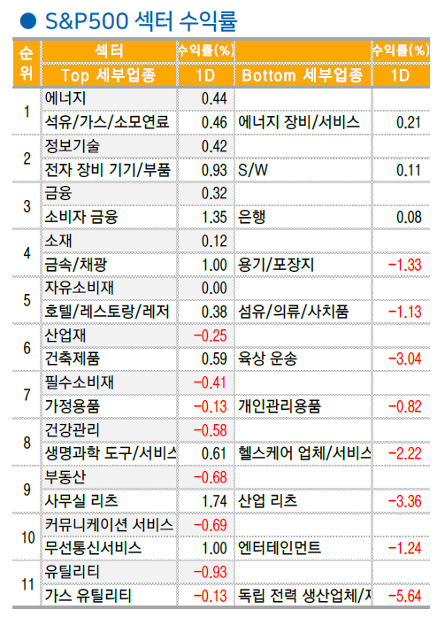 TSMC 어닝 서프라이즈에 따른 반도체 강세로 상승 출발한 증시. 9 월 소매판매와 주간 신규실업수당청구건수 등 경기지표 호조로 급등한 국채금리의 영향을 이기지 못하고 상승폭을 축소하다 하락 전환.금리 인하 기대감의 축소로 AI 모멘텀과 실적 기대감이 집중된 반도체 업종으로의 쏠림이 부각 유가 상승을 반영한 에너지 업종(+0.4%)이 가장 견조한 상승률 기록했으며 IT(+0.4%), 금융(+0.3%), 소재(+0.1%) 등이 뒤를 이음.