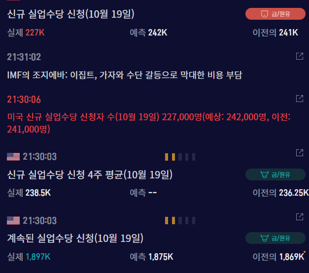 주간실업수당청구, 10월 19일로 끝나는 주에 대한 미국 신규 실업수당 신청 건수는 227,000건으로 기록되어 9월 28일 주 이후 최저치를 기록했습니다. 미국 연속실업수당청구건수 1,897K : 예상치 0.9% 상회. 허리케인과 보잉 파업의 영향 지속을 예상한 컨센(24.3 만건)도 하회. 다만 두 변수의 영향으로 최근 지표의 변동성과 불확실성이 높아졌단 평가. 연속실업수당 청구건수는 189.7 만으로 전주대비 2 만명 가량 상승하며 3 주연속 상승세 지속