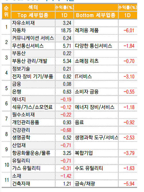 11 개 섹터 중 자동차(+18.7%)가 주도한 경기소비재(+3.2%), 컴스(+0.2%) IT(+0.2%)등의 섹터가 상승 마감했으며 소재(-1.4%), 유틸리티(-0.7%)는 부진. S&P500 종목 중 249 개 기업이 상승 마감에 성공하며 전반적 시장 분위기는 나쁘지 않았던 모습