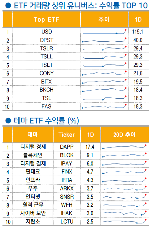 M7 내에서도 확실한 차별화 발생. AI 와 FSD 등의 신기술 규제에 상대적으로 관대한 트럼프 정부의 등장과 빅테크 저격수로 알려진 FTC 위원장 리나 칸의 입지 불확실성에 마이크로소프트(+2.1%), 알파벳(+4.0%), 아마존(+4.1%), 엔비디아(+4.1%) 등 대부분 지수와 함께 견조한 흐름 유지. 반면 메타(-0.1%)는 한차례 트럼프와의 마찰이 있었던 만큼 부진했으며 애플(-0.3%)은 스티브 잡스의 부인인 로렌 파월 잡스가 해리스의 지지자이며 중국과의 무역 갈등에 따른 스마트폰 판매 우려가 부각 반면 해리스 트레이드의 주축이었던 재생에너지 업종은 퍼스트솔라(-10.1%)를 비롯 태양광 ETF 인 TAN(-10.8%), 클린에너지의 ICLN(-7.3%) 등 급락