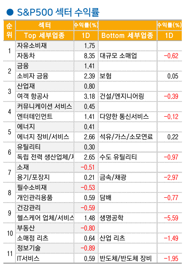 에너지 업종(+0.4%) 역시 트럼프 정부의 화석연료 친화적 정책 기대감에 최근의 유가 급락에도 견조한 모습. 슐럼버거(SLB +2.6%), 핼리버튼(HAL +3.1%) 등 강세. [트럼프는 1 기 집권 시 보호지역 개발허용, 석유 파이프라인 환경검토 면제] 등의 과감한 규제 완화를 단행한 바 있음.11 개 섹터 중 6 개가 상승 마감에 성공했으며 건설/엔지니어링(-0.4%), 소재(-0.5%) 등 중국 전인대 실망감을 반영한 섹터는 부진
