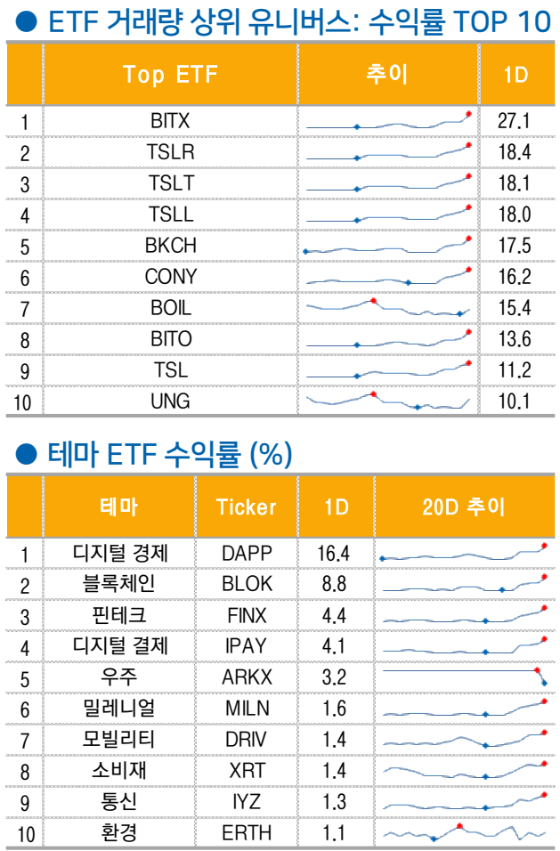 에너지 업종(+0.4%) 역시 트럼프 정부의 화석연료 친화적 정책 기대감에 최근의 유가 급락에도 견조한 모습. 슐럼버거(SLB +2.6%), 핼리버튼(HAL +3.1%) 등 강세. [트럼프는 1 기 집권 시 보호지역 개발허용, 석유 파이프라인 환경검토 면제] 등의 과감한 규제 완화를 단행한 바 있음.11 개 섹터 중 6 개가 상승 마감에 성공했으며 건설/엔지니어링(-0.4%), 소재(-0.5%) 등 중국 전인대 실망감을 반영한 섹터는 부진