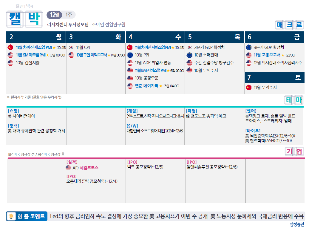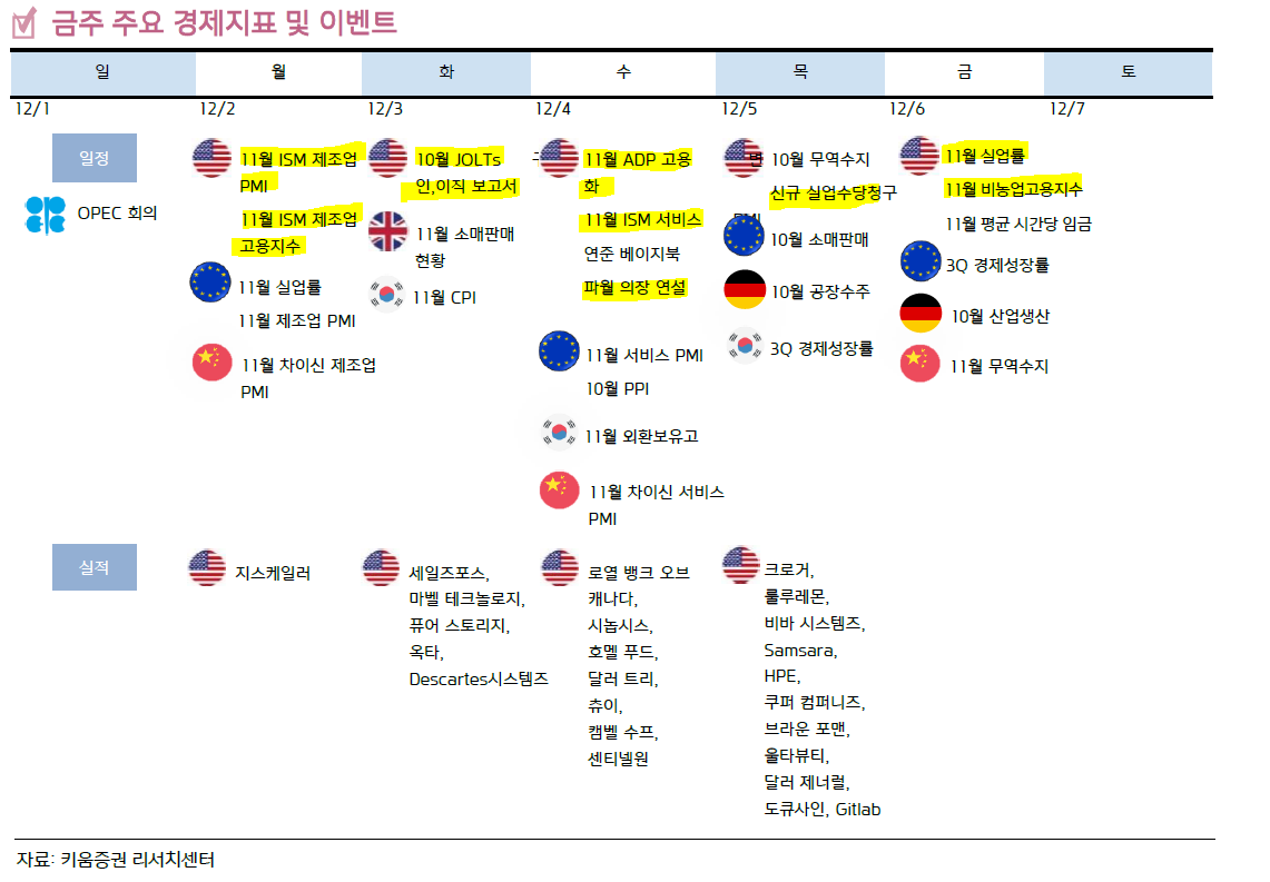 ISM제조업PMI, 11 월 ISM 제조업 PMI 는 [48.4pt 로 컨센(47.7pt) 상회]. 아직까진 8 개월 연속 위축 국면을 이어가고 있으나 전월(46.5pt) 대비 대폭 개선. 하위 지수 중 신규 주문이 50.4pt 를 기록하며 전월(47.1pt)대비 큰 폭으로 상승, 7 개월만의 확장 국면 전환에 성공. 생산, 고용 등도 개선. 반면 가격 부문은 전월 비 -4.5pt 하락한 50.3pt 기록.