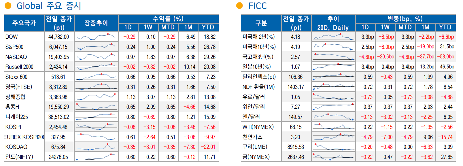 미 국채 금리는 2Y 4.18%(+3.3bp), 10Y 4.19%(+2.5bp)로 견조한 경기지표를 반영하며 상승.
