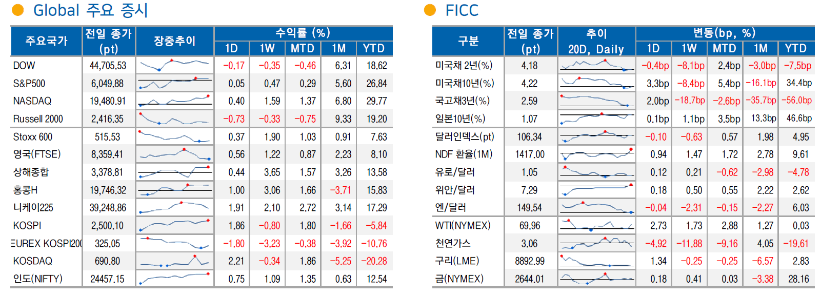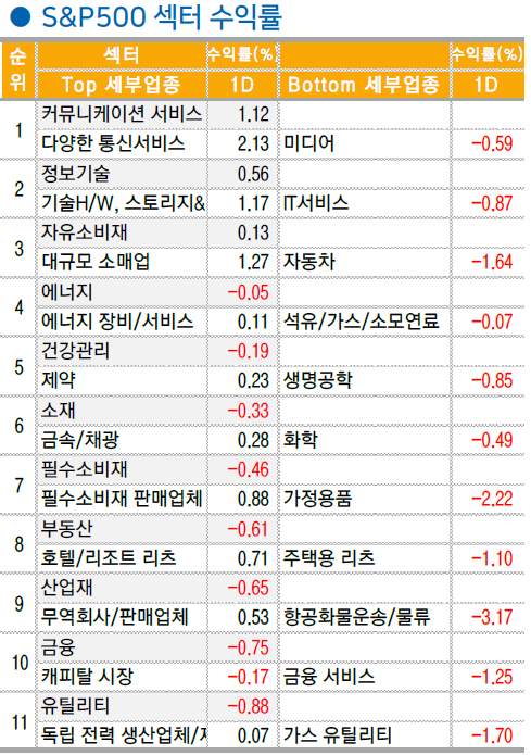 S&P500 기업 중 347 개 기업이 하락마감 했으며 중소형주 중심의 러셀 또한 부진. 다만 메타(META +3.5%), 아마존(AMZN +3.5%), 엔비디아(NVDA +1.2%) 등의 M7 및 대형 기술주의 강세가 두드러지며 증시를 랠리를 이어가는 모습. 팔란티어(PLTR +6.9%) 등이 급등하며 IT 업종 내에서도 AI 산업성장의 수혜가 s/w, 기술 h/w 등으로의 확산되는 흐름도 지속