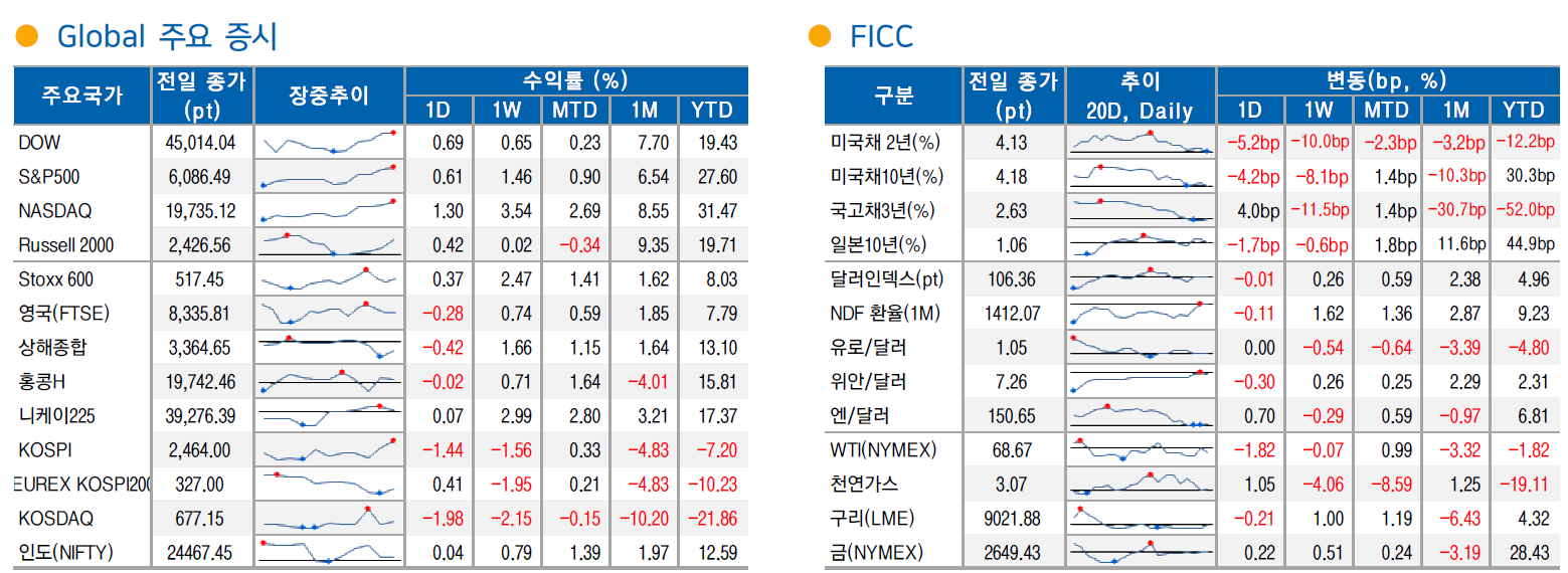 미 증시는 DOW +0.73%, S&P 500 +0.60%, NASDAQ +1.30%, Russell 2000 +0.42%로 상승 마감.
