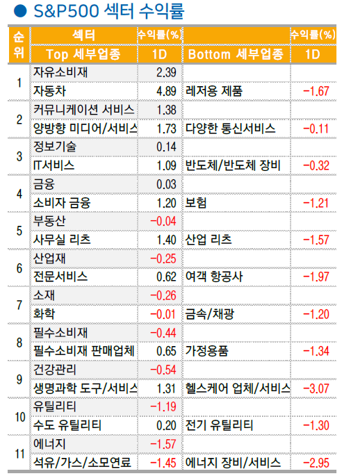 S&P500 기업 중 298 개 기업이 하락 마감했으며 에너지(-1.6%), 유틸리티(-1.2%), 헬스케어(-0.5%), 필수소비재(-0.4%), 소재(-0.3%) 등 11 개 섹터 중 7 개 섹터가 하락