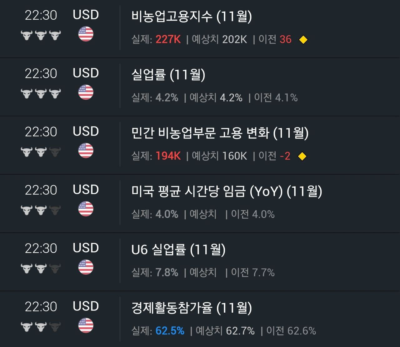 11 월 비농업 고용은 22.7 만명 증가하며 컨센(20.2 만) 상회. 2.4 만명 가량 상향 조정된 전월(3.6 만) 수치 대비로도 급등한 모습. 다만 민간고용 부문은 19.4 만명으로 컨센(20.5 만)을 하회. 전월 하락 기록했던 전문/사업 서비스, 제조업이 재차 반등에 성공했으며 헬스케어, 레저, 정부 등의 신규고용도 증가. 실업률은 4.25% 기록하며 컨센(4.1%)과 전월치를 상회. 시간당 임금, 평균주간노동 시간은 대체로 시장 컨센에 부합 또는 소폭 상회.< 🇺🇸 11월 고용보고서 컨센 혼조 > 1️⃣ 비농업 고용 실제 227k / 컨센 220k / 이전 12k (수정 36k) *민간: 실제 194k / 컨센 205k / 이전 -28k (수정 -2k)