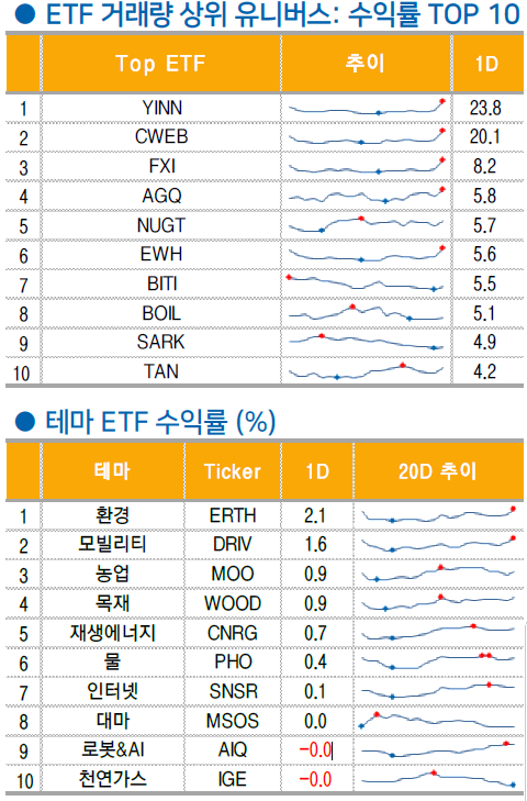 중국 경기 부양책에 대한 기대감으로 전일 항셍지수가 +2.8% 급등. 미 증시에서도 미국 상장 중국기업 ETF 인 PGJ 가 +8.6% 급등했지만 소재(-0.2%)와 에너지(-0.2%) 섹터가 지수 대비 소폭 아웃퍼폼한 것을 제외하면 미 증시 자체에 대한 영향력은 제한적인 모습