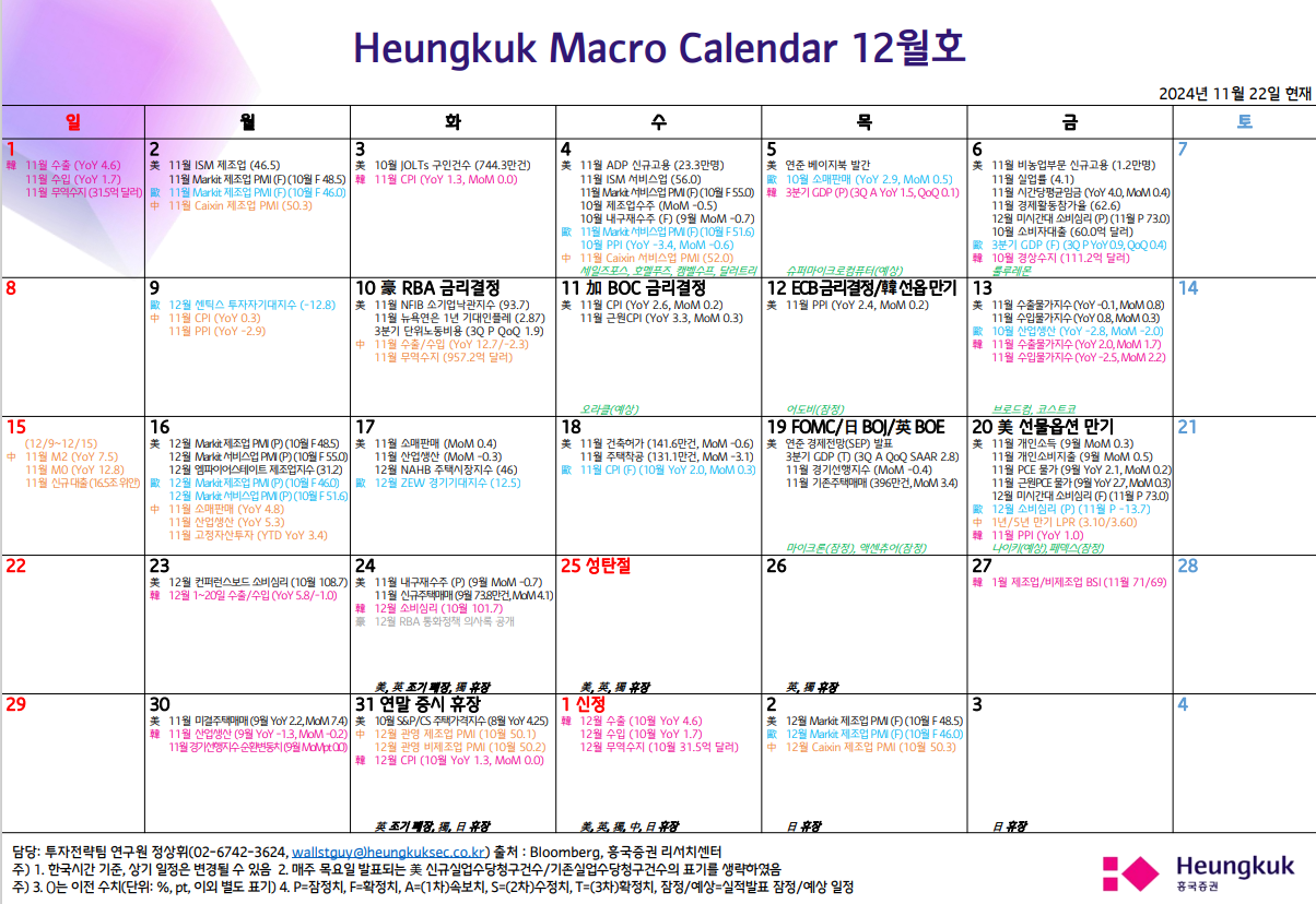 - ECB, 12 월 ECB 통화정책회의 이후 유로존 주요 정책금리를 25bp 씩 인하하기로 결정. 예금금리 기준 3.25%→3.00%로 인하. 경제 성장 전망에서도 하향조정이 이뤄짐. 올해 유로존 성장률은 0.8%YoY→7%YoY, 내년 성장률은 1.3%YoY→1.1%YoY 로 하향. 라가르드 총재는 [성장리스크가 하방으로 더 치우쳐 있다라고 우려]를 표시. 기업들은 불확실성에 투자를 보류하고 있으며 최신 지표들은 모멘텀이 둔화하고 있음을 강조. 더해 [이번 경제 전망에서는 트럼프 행정부의 무역 및 관세 영향을 완전히 반영하지는 않았다]고 덧붙였고 50bp 인하를 검토하는 일부 논의가 있었음을 언급하며 우려 가중