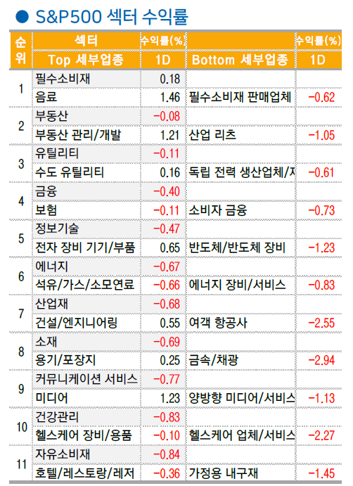 랠리를 주도했던 나스닥과 대형 기술주를 중심으로 매물 출회. 국채 금리 또한 단기물 중심으로 상승함에 따라 증시에 부담으로 작용하는 모습12 월 ETF 기준 10%가량 상승하며 증시를 주도했던 M7(MAGS,-0.8%) 기업들 전반 부진. 보합권 마감한 애플(AAPL +0.6%), 마이크로소프트(MSFT +0.13%)를 제외 모두 하락마감. 특히 양자칩 모멘텀으로 급등하던 알파벳(GOOGL -1.8%)과 $400 선을 돌파한 테슬라(TSLA -1.6%)에 매물출회 집중. 어도비(ADBE -13.7%)의 가이던스 쇼크도 AI 산업 전반에 하방압력으로 작용