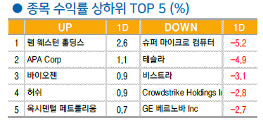 경기소비재(-1.9%), IT(-1.5%), 컴스(-1.1%), 금융(-0.8%) 등 24 년 상승세가 두드러졌던 업종 중심의 하락세미 국채 금리는 2Y 4.33%(-0.2bp), 10Y 4.63%(+4.3bp)로 장기물 중심의 상승. 12 월 FOMC 이후 4.6% 선 부근 등락을 이어가던 10Y 금리는 5 월 29 일 이후 처음으로 4.6%선 위에서 종가를 형성.