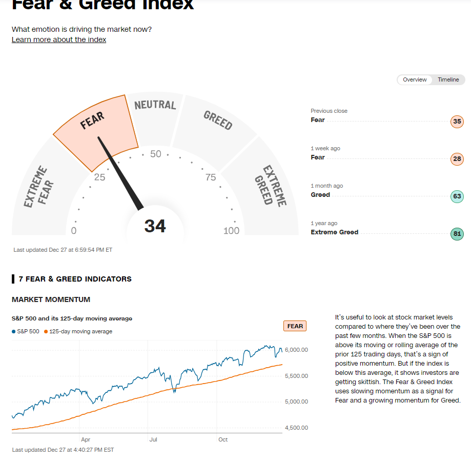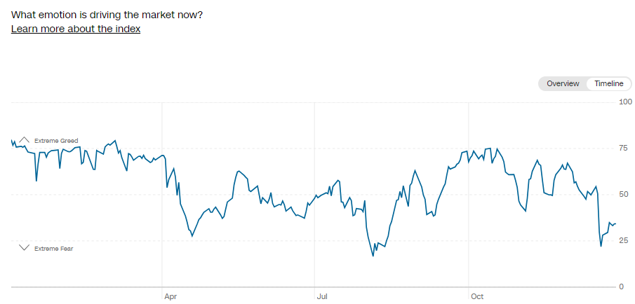 주요 심리지표 중 하나인 CNN 의 곰포탐욕지수는 27 일 기준 34pt 로 공포영역에서 회복에 어려움을 겪는 모습.