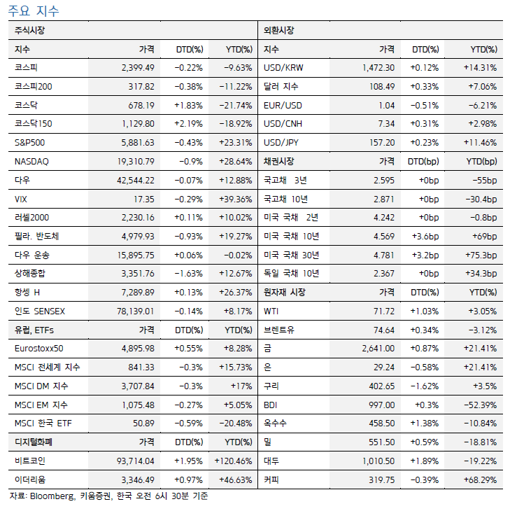 엔비디아(NVDA -2.3%) 틱톡의 모회사 ByteDance의 엔비디아칩 구매 관련 뉴스와 Bit Digital과의 대규모 gpu 공급계약, 로봇 산업 참여 이슈 등 호재들이 있었음에도 하락세 보이며 기술주 전반에 악영향. 미래에셋은 규제 우려로 보고있었음