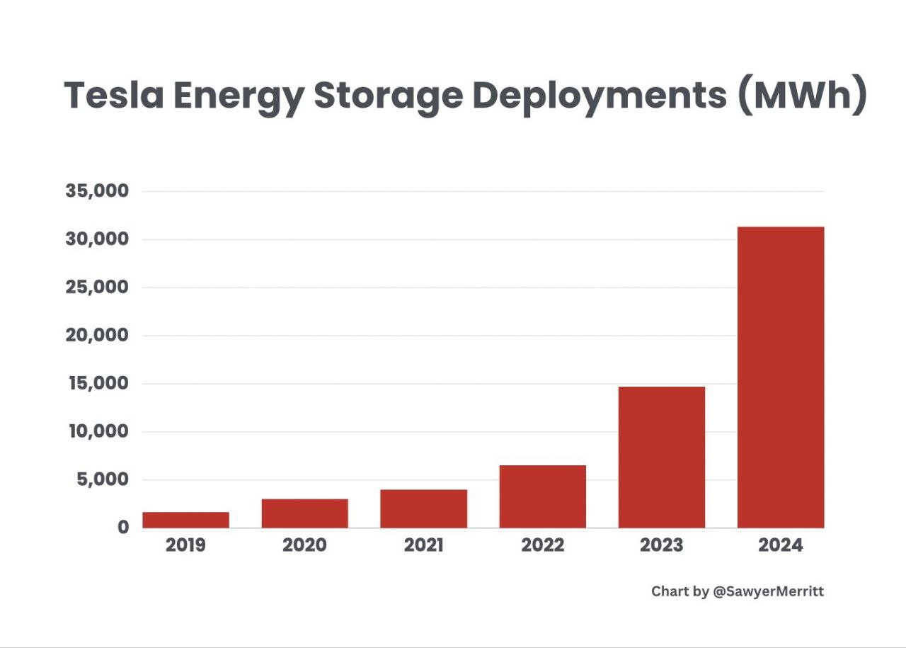 테슬라는 또한 2024년 4분기에 11GWh의 에너지 저장 장치를 배치했으며, 이는 전년 대비 243% 증가한 수치라고 밝혔습니다.