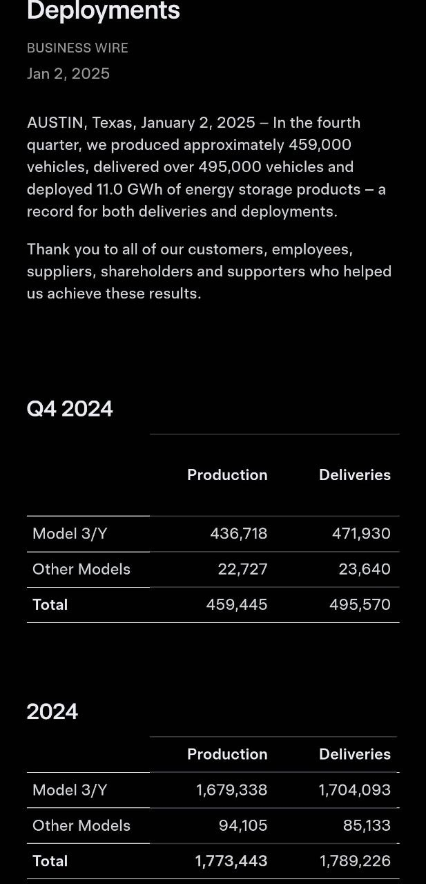 테슬라의 2024년 연간 차량 판매량은 179만 대로, 2023년의 180만 대와 시장 예상치에 미치지 못했다. 4분기 차량 인도량은 49만 5,570대로, 애널리스트 예상치인 51만 2,277대에 못 미쳤다.