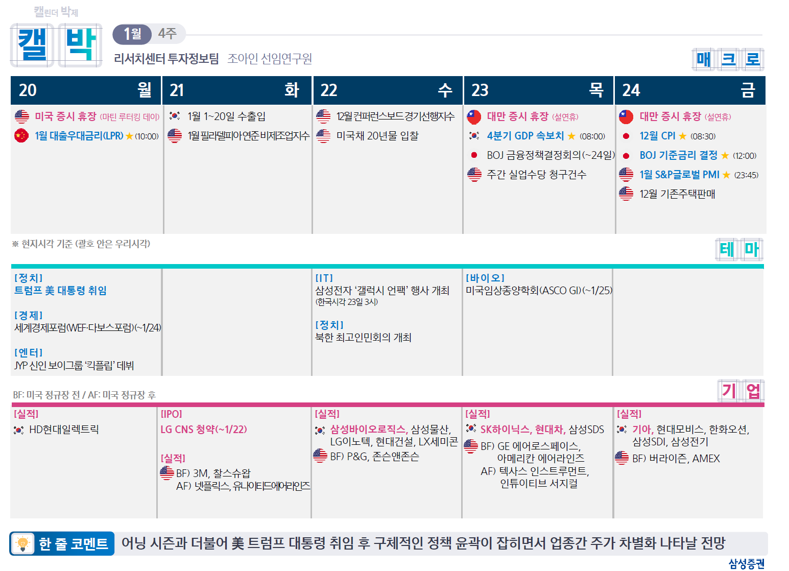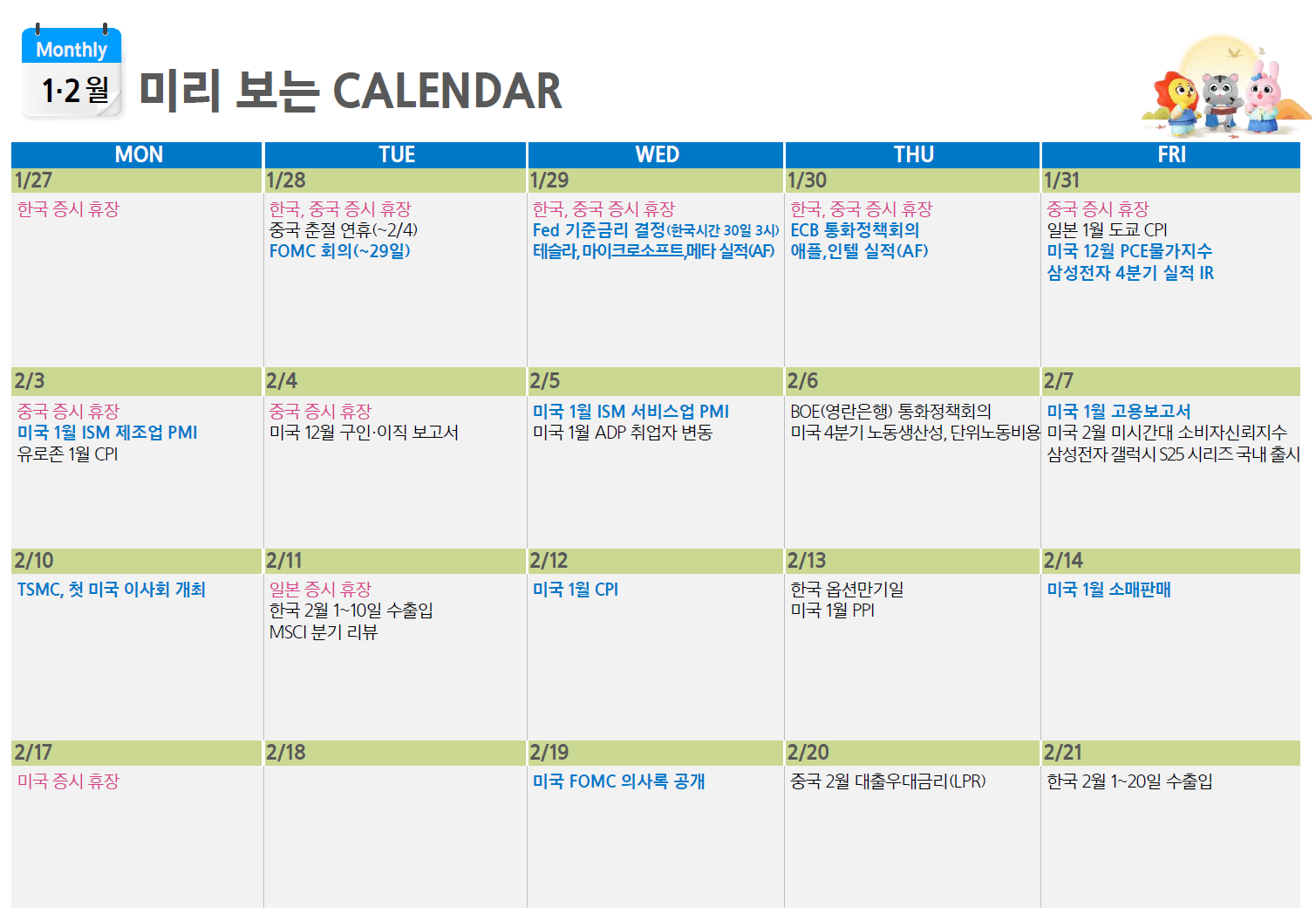 이런 가운데 신화통신이 트럼프와 시진핑이 전화 통화를 했으며 주요 문제에 관해 정기적인 접촉을 유지하기로 합의 했다고 보도. 더불어 중국과 미국 사이에는 피할 수 없는 차이가 있지만 주요 관심사를 존중하고 문제를 해결하는 적절한 방법을 찾을 것이라고 보도. 대만 문제는 중국 주권 문제이고 미국은 매우 신중하게 처리해야 한다며 여전히 갈등이 있음을 보여줌 [트럼프도 “시진핑과 통화를 가졌는데 양국 모두에 매우 좋은 결과였다” 라고 언급. 더불어 “무역 균형, 펜타닐, 틱톡 등 다양한 주제를 논의 했으며, 즉각적으로 문제들을 해결하기 시작할 것]으로 기대한다” 라고 발표. 결국 트럼프 2기 가장 우려하고 있는 미-중 무역갈등이 진행되겠지만, 시장이 우려하는 강경한 마찰이 아닐 수 있다는 기대가 유입. 이에 대부분의 반도체, 중국 물품 판매가 많은 업체, 중국 기업들의 강세가 뚜렷하게 진행되며 주식시장 상승을 견인.