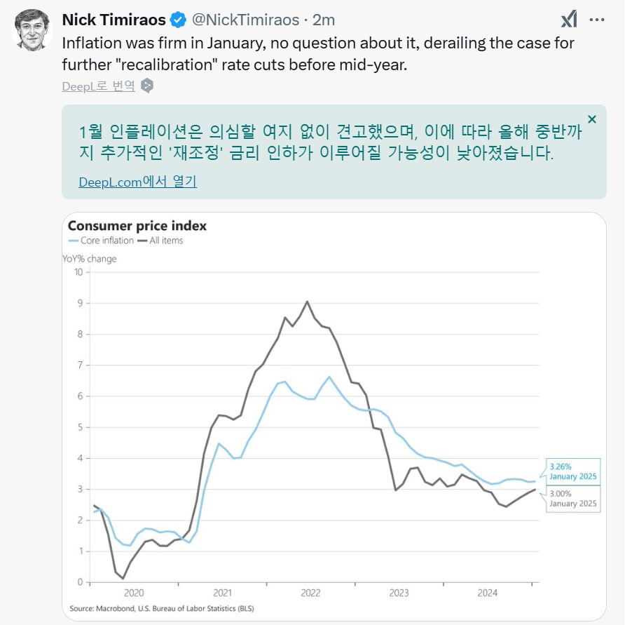 아직 3월 FOMC까지 인플레이션과 고용 이벤트가 한번 씩 더 남아있으며, 관세도 인플레이션 판을 다시 짤 정도 격하게 부과되지 않을 것으로 생각하고 있습니다.