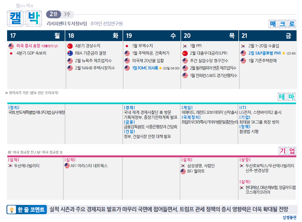 FOMC 의사록, 공개된 1 월 FOMC 의사록에서는 1)부채한도 해결까지 QT 중단 논의, 2)트럼프 정책들의 물가 자극 우려, 3)금리 인하 전 더 많은 물가 둔화 증거의 필요 등이 확인. 시장은 QT 중단 가능성에 집중하며 의사록 발표 이후 국채 금리는 하락
