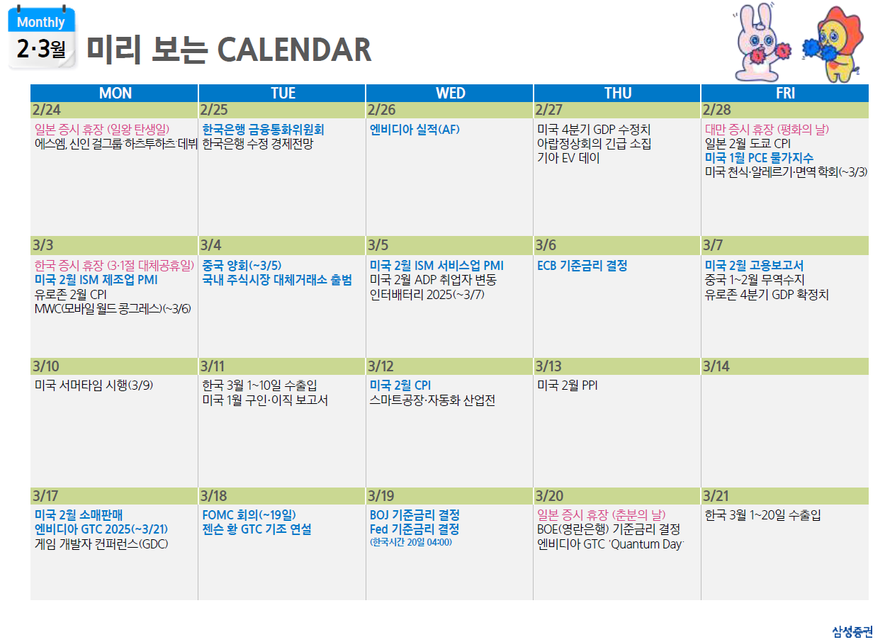 트럼프는 자동차에 이어 반도체와 의약품에 최소 25%의 관세 부과 방안을 4 월 2 일 발표할 것이라 언급. 기존 보편 및 상호 관세 정책과 어떤 방식으로 공존될지에 대한 언급은 부재. 다만 이후 미국에 공장을 건설할 기회를 주고 싶다와 같은 협상 및 속도조절의 의지를 보이는 발언을 이어감. 이에 시장은 지난 1 월과 같이 급격한 반응보단 관망세에 가까운 움직임을 보이며 일부 면역이 생긴 모습