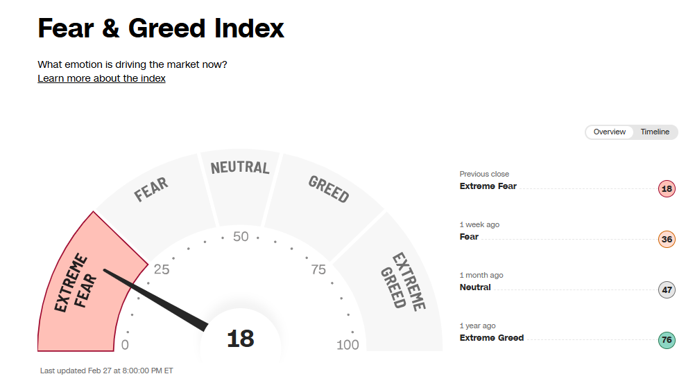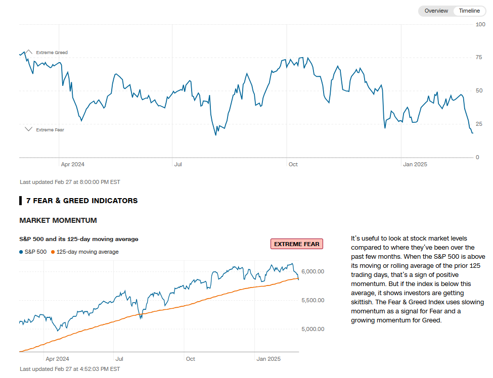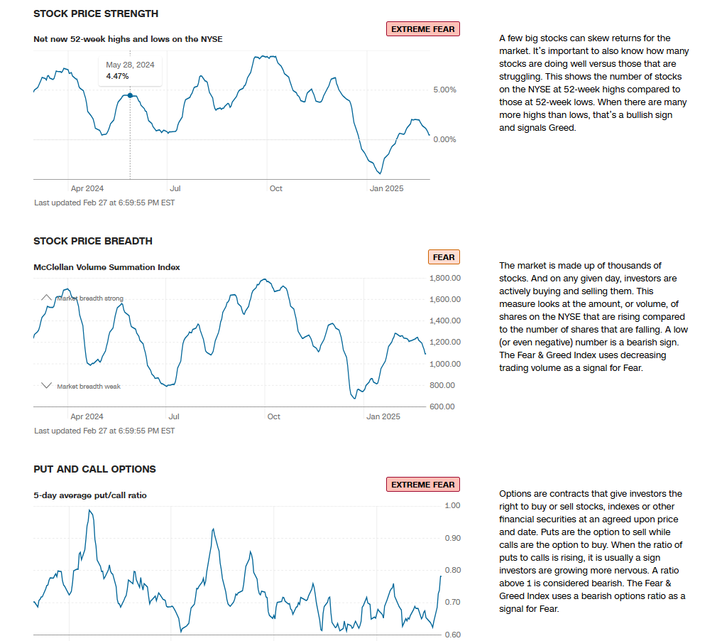 CNN 공포탐욕지수는 18pt 로 극도의 공포 구간에 진입. 이는 지난 24 년 8 월 급락 때와 비슷한 수준. 시장의 폭, 모멘텀, 풋콜옵션비율 등 대부분의 하위지표들이 극도의 공포 구간. 특히 모멘텀 지표인 S&P500 125 일 이평선을 금일 돌파하며 8 월과 동일한 모습 연출. 최근 M7 을 중심으로 추세적 하락세에 접어들고 있다는 공포도 확산. M7 ETF 인 MAGS 에 중단기 데드크로스가 발생하는 등의 움직임은 헷지펀드들의 CTA 전략 상, 매도 압력을 부여할 수 있는 시그널미국으로의 자금 유입이 1,2월 둔화된 가운데 투자 심리 위축되고 엔비디아가 8.5% 급락하는 등 추가 하락이 진행되자 장 후반 낙폭 확대되며 마감(다우 -0.45%, 나스닥 -2.78%, S&P500 -1.59%, 러셀2000 -1.59%, 필라델피아 반도체 지수 -6.09%)
