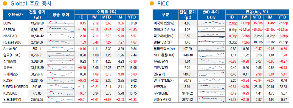 국채 금리는 트럼프가 중국에 대한 추가 관세 부과 등을 발표하자 물가에 대한 우려가 부각된 가운데 4분기 근원 PCE 가격이 2.5%에서 2.7%로 상향 조정하는 등 물가 부담도 영향을 주며 상승. 여기에 연준 위원들이 한동안 금리를 동결해야 하는게 적절하다고 주장한 점도 금리 상승 요인. 그러나 [관세 이슈가 결국 경기에 대한 불안 심리를 자극하며 안전자산 선호심리가 높아지자 장 후반 금리 상승폭이 축소된 점도 특징]