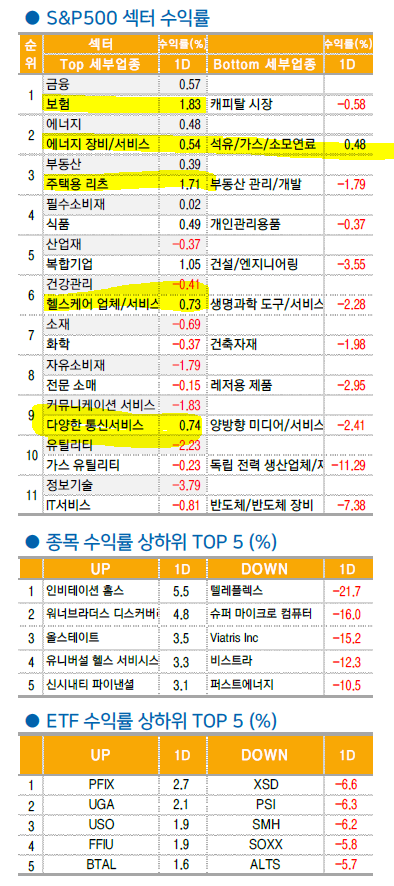 모더나(MRNA -7.42%)는 트럼프가 모더나의 조류 독감 치료제에 대한 자금 지원을 중단할 것이라고 발표하자 하락. 화이자(PFE -1.21%), 바이오앤텍(BNTX -4.56%) 등도 동반 부진. 반면, 머크(MRK +1.34%), 브리스톨마이어스(BMY +2.47%), 유나이티트헬스(UNH +1.07%) 등 제약, 헬스케어는 경기 방어적 성향에 상승. 월마트(WMT +0.61%), 펩시코(PEP +0.34%) 등도 강세